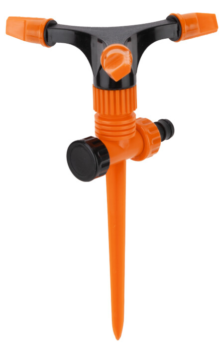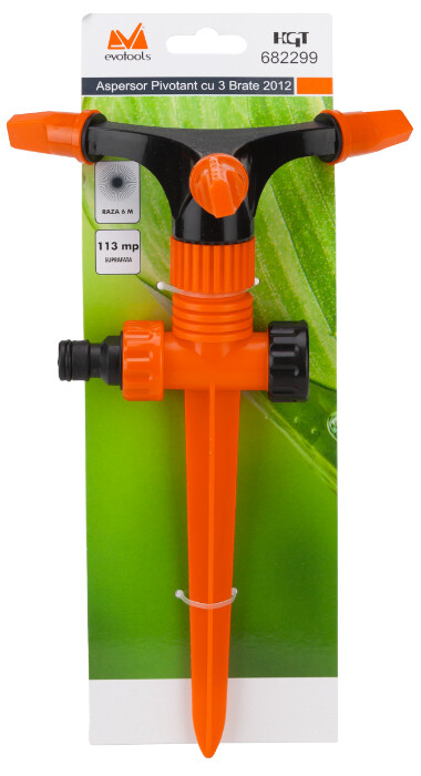 Aspersorul Pivotant cu 3 Brate este un dispozitiv de udare care permite stropirea suprafetelor de pana la 113 m 2 . Acesta este realizat din material plastic rezistent la distrugere (ABS). Este un dispozitiv de udare eficient si puternic, proiectat pentru a acoperi zone mari de teren cu apa intr-un mod precis si eficient. Specificatii: Este realizat din material plastic rezistent la distrugere (ABS) Permite stropirea suprafetelor de pana la 113 m 2 la o presiune de lucru cuprinsa intre 4-6 bar Are un diametru de stropire de 12 m si un debit maxim de 6 L/min Constructia in forma de tija ii permite plasarea usoara in gazon fara a il deteriora
