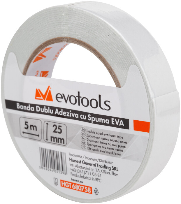 Banda dublu adeziva compusa dintr-un suport de spuma din etilen-vinil acetat (EVA) foarte maleabil, pentru o fixare rapida si puternica chiar si la presiuni de fixare mici si un adeziv acrilic vascos, ce permite aderenta imediata la numeroase materiale.