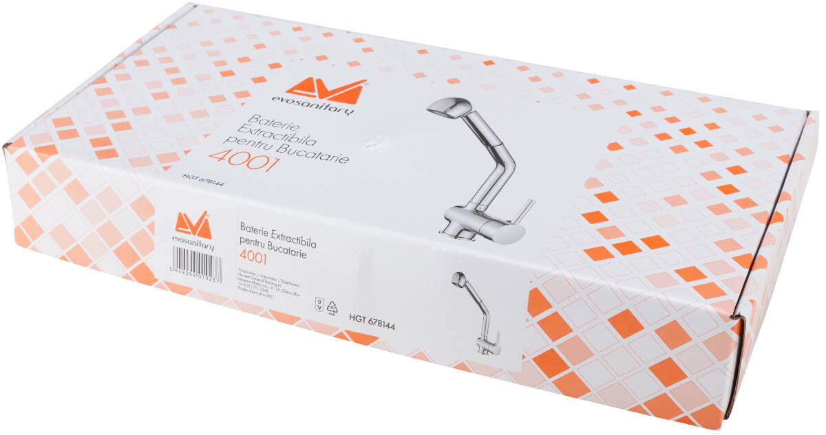 Bateria EVOSANITARY de tip monocomanda are corpul confectionat din alama, cu un finisaj lucios de culoare argintie.