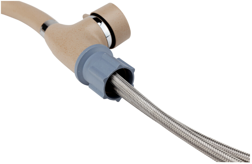 Bateria EVOSANITARY de tip monocomanda pentru bucatarie are corpul confectionat din alama cu un finisaj facut prin vopsire in camp electrostatic.