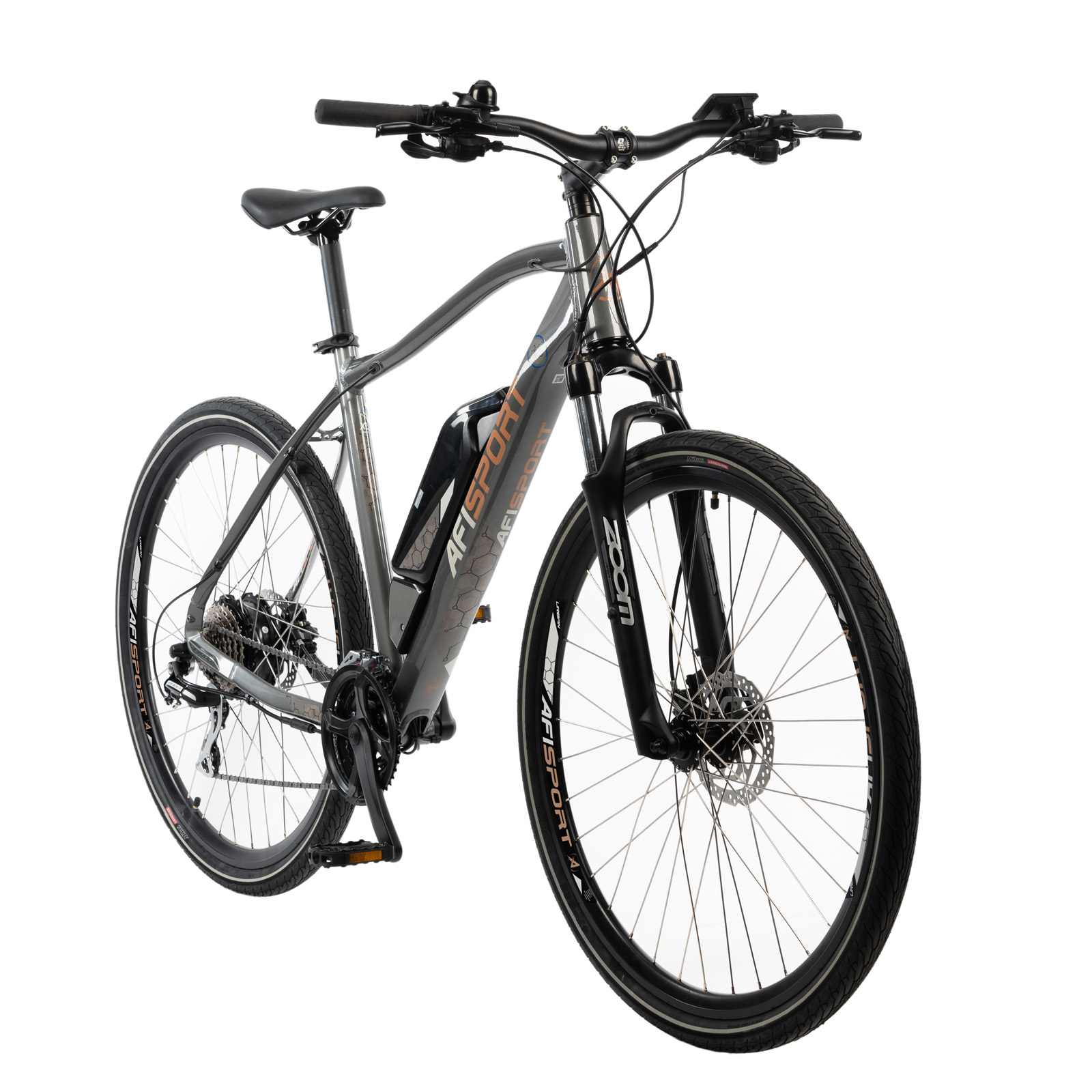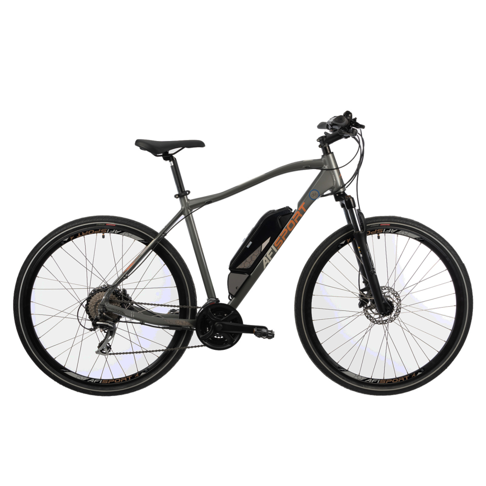Bicicleta Electrica Afisport C17 este o bicicleta urbana electrica dezvoltata in colaborare cu Bucharest Bike Traffic, avand un design special personalizat, are un cadru bine lucrat din aluminiu, o greutate totala de cca 21,9 kg, roti de 28 inch, o echipare foarte buna de la Shimano, suspensie fata, 3x8 viteze, frane hidraulice pe disc, anvelopele Rubena, iar bateria este extrem de usoara Lithium-Ion 36V, 10.4 Ah, autonomie intre 50km - 70km. E-Bike Afisport C17 are o vopsea mata interesanta, o grafica deosebita pe cadru, bateria este atat de usoara ca o poti tine intr-un deget, motorul este amplasat roata spate fiind un motor in butuc destul de puternic 250W. Pe cabluri am aplicat niste cauciucuri speciale pentru a sta mai bine aliniate, fara sa se incurce. Mansoanele mtb sunt usoare si cu o priza buna, anvelopele Rubena sunt special pentru oras-urban, drum forestier sau pietruit, iar display-ul digital de pe ghidon iti va arata o serie de parametrii importanti cum ar fi viteza de deplasare, numar km parcuri, nivel acumulator etc. Bicicletele electrice se adreseaza utilizatorilor care vor sa pedaleze atat in oras, cat si celor pasionati de off road/MTB. Bicicleta electrica a devenit o moda in majoritatea tarilor europene, fiind foarte des utilizata in deplasarea oamenilor in oras si in afara orasului. Marele avantaj al bicicletei electrice este acela ca este ideala pentru persoanele care au probleme cu articulatiile sau au mobilitate scazuta, dar vor sa se deplaseze pe bicicleta folosind asistenta la pedalare.