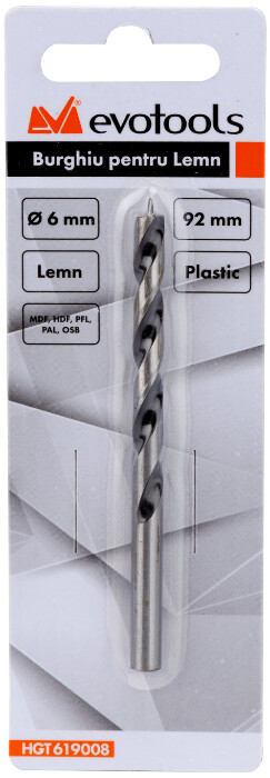 Burghiul Lemn EvoTools este fabricat din otel-carbon de inalta calitate si este adecvat pentru gaurire in lemn. Acesta poate fora eficient gauri in lemn datorita varfului de centrare cu 2 muchii de taiere. Spirala prevede eliminarea corespunzatoare a materialului excavat, prevenind supraincalzirea burghiului si infundarea gaurii cu reziduuri de gaurire.