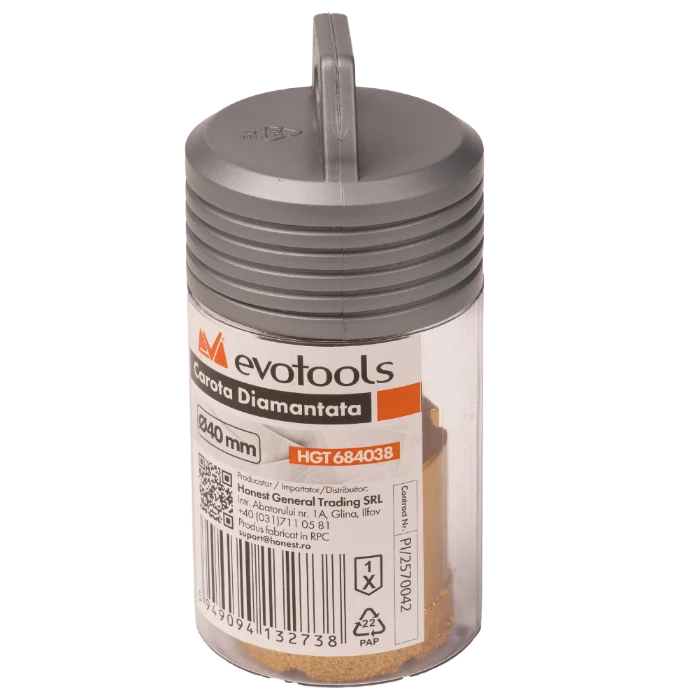 Carota diamantata Evotools este o unealta destinata perforarii precise, oferind versatilitatea de a fi utilizata atat in regim umed, cat si uscat. Designul auriu si constructia robusta din otel 45# cu finisaj de nichel asigura rezistenta ridicata in timpul utilizarii.