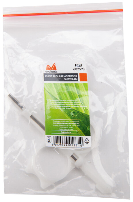 Cheia de reglare pentru aspersor subteran este un instrument esential pentru intretinerea si ajustarea sistemelor de irigatii subterane. Acest instrument faciliteaza reglarea precisa a aspersoarelor pentru a asigura o acoperire uniforma a zonei de irigare si pentru a optimiza consumul de apa. Acest produs este compatibil cu: Aspersor Subteran Rotativ Evotools. Caracteristici principale: Constructie durabila: Fabricata din plastic de inalta calitate, cheia de reglare este rezistenta la coroziune si uzura, asigurand o utilizare indelungata. Usor de utilizat: Simplu de folosit, chiar si pentru cei fara experienta tehnica, oferind o solutie rapida pentru reglarea sistemelor de irigatii.