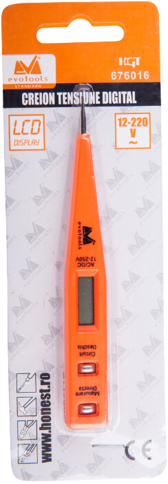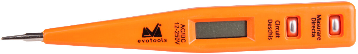 Creionul de tensiune digital EvoTools este confectionat din otel si polipropilena, avand suprafata izolata. Se poate folosi pentrua masura tensiuni cuprinse intre 12-220 V, in curent alternativ (AC) sau continuu (DC). Acesta are functie de afisare a valorii aproximative in trepte prestabilite 12, 36, 55, 110, si 220 V. Este fabricat conform standardelor europene in vigoare.