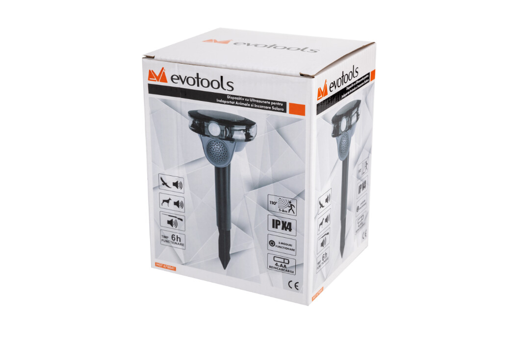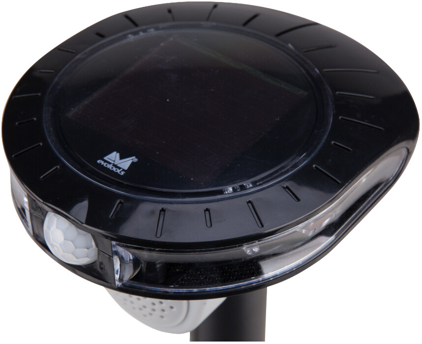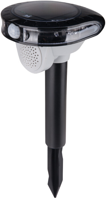 Acest produs combina lumina intermitenta a LEDului si infrarosul pasiv, cu sunetele ce imita impuscaturile, sunetul de vultur si caine pentru a respinge animalele nedorite, liliecii si pasarile din pomii fructiferi, peluze, gradini, paturi de flori si iazuri de peste.