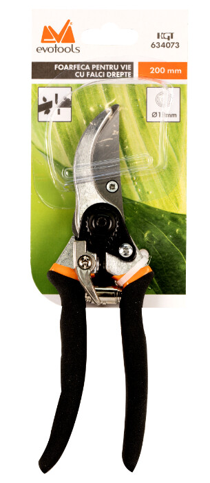 Foarfeca pentru vie EvoTools are falcile taietoare, cu rozeta de reglarea a fortei de strangere, confectionate din otel carbon de inalta calitate, tratat termic, cu o duritate de 48-52 HRC. Manerele ergonomice confectionate din aluminiu acoperit cu policlorura de vinil (PVC) si arcul pretensionat va permit o priza optima, reducand riscul alunecarii, si o manevrare usoara in timpul utilizarii, pentru a putea taia cu usurinta ramuri cu diametrul de pana la 15 mm. Acest tip de foarfeca este proiectata pentru a efectua lucrari de ingrijire a gradinii sau a butasilor de vita de vie.