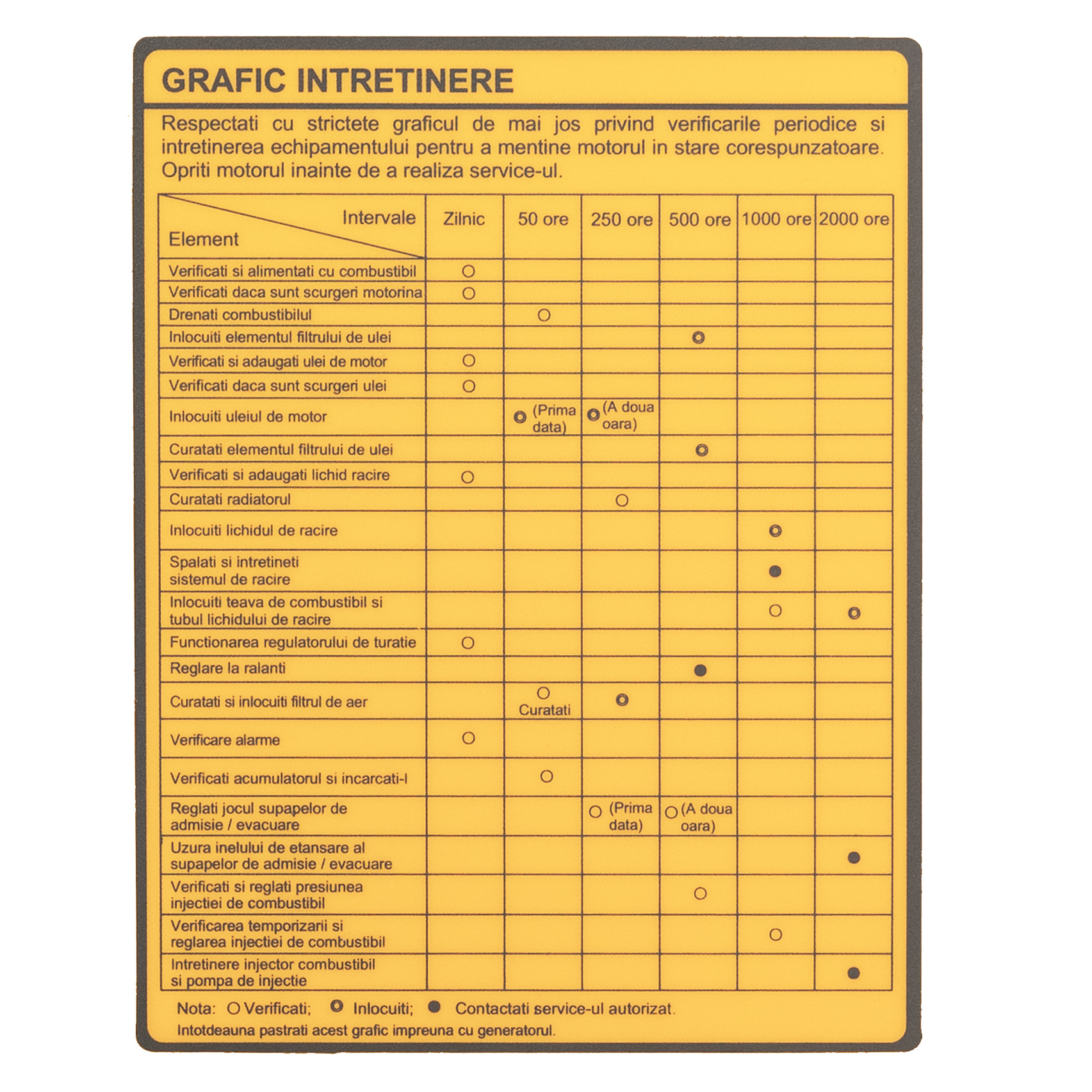 Combustibil: motorină conform sezonului (0# vară, -10# iarnă, -35# temperaturi scăzute)