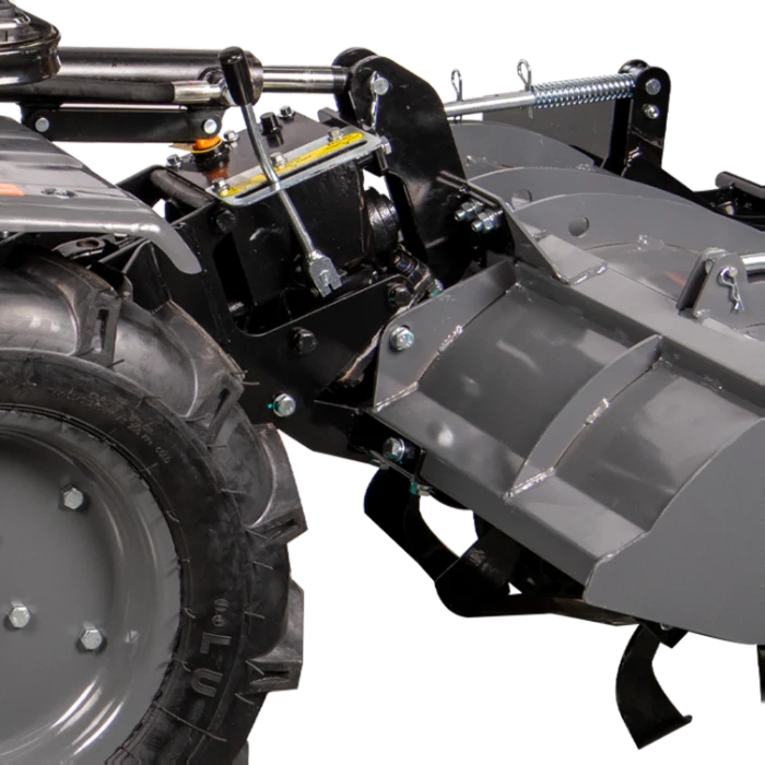 Constructia solida, cu greutate de 384 kg, asigura stabilitate si durabilitate, iar transmisia cu 4 viteze inainte + 1 viteza inapoi permite adaptarea rapida la diferite tipuri de lucrari.