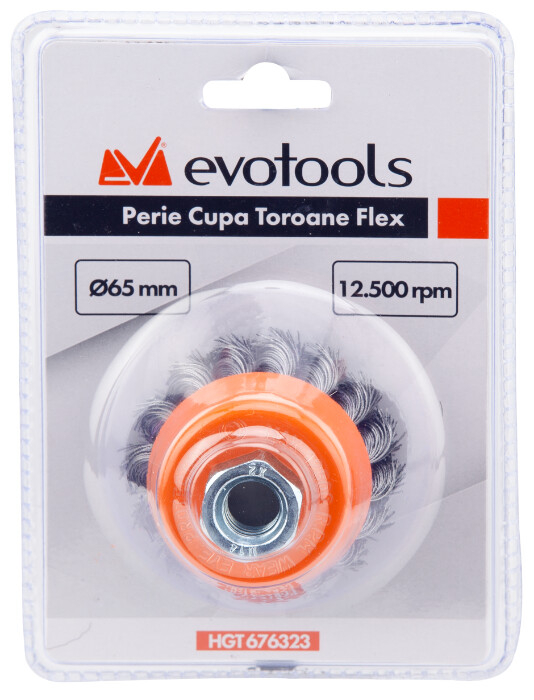 Perie Cupa Toroane Flex - Polizor Unghiular Evotools cu ax de montaj filetat M14 este destinata utilizarii pe polizoare unghiulare in operatii de curatire, debavurare, eliminare a oxizilor, vopselei, etc.;