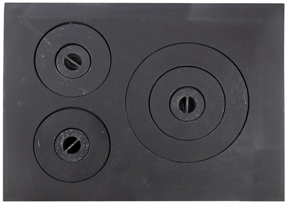 Dimensiuni de montaj (Lxl mm): 470x345 Plita pentru sobe traditionale, confectionata din fonta, Design rotunjit la muchii cu trei ochiuri cu diametrul maxim de 240 mm Durabilitate ridicata