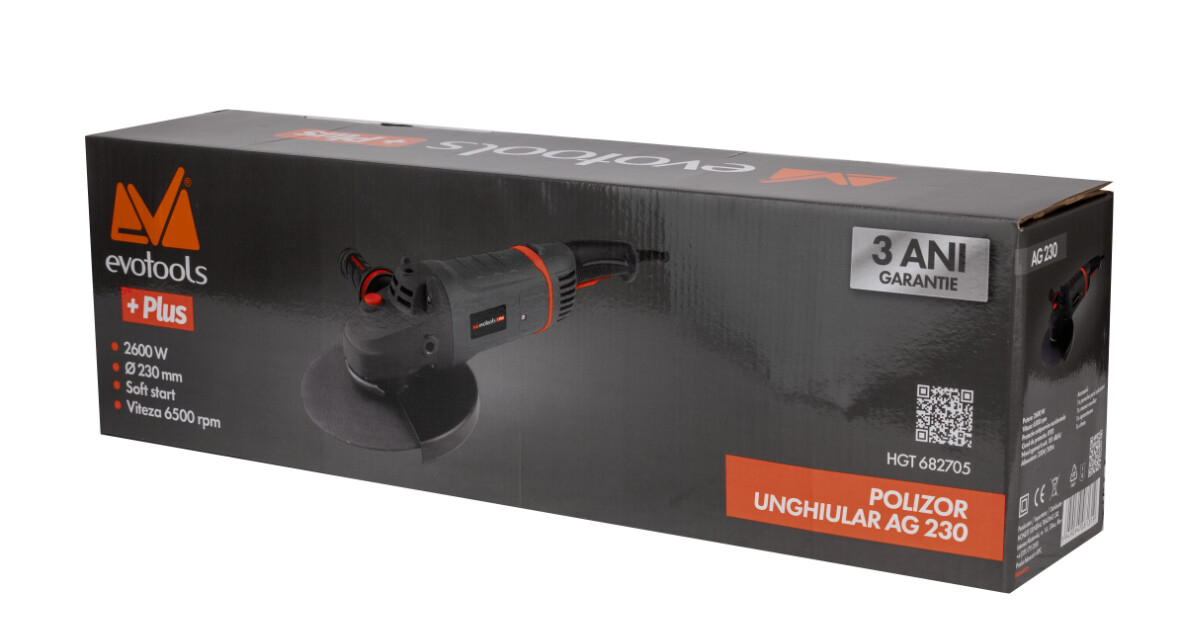 Polizorul Unghiular AG 230 - 2600W EPTO PLUS are un motor de 2600W ce asigura o turatie de 6500 de rotatii pe minut.