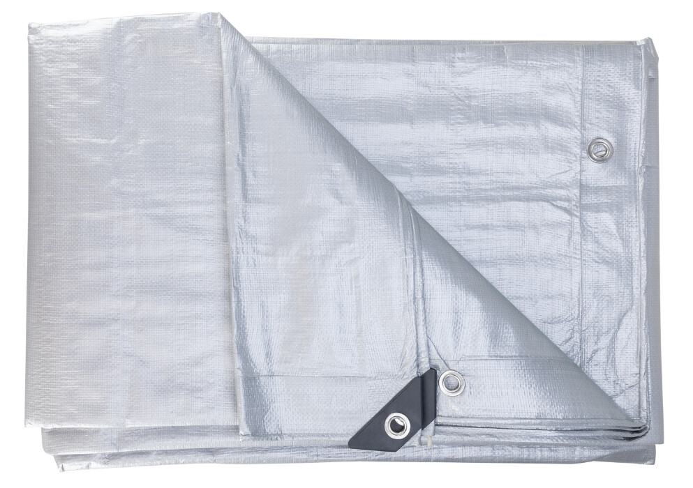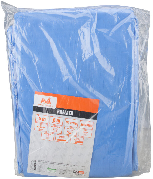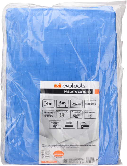 Prelata tesuta 100 % din PE, prevazuta cu inele metalice din 0.5 in 0.5 m, utilizata pentru protectia diverselor materiale impotriva intemperiilor si razelor solare, in transport, agricultura, constructii, camping, uz caznic.