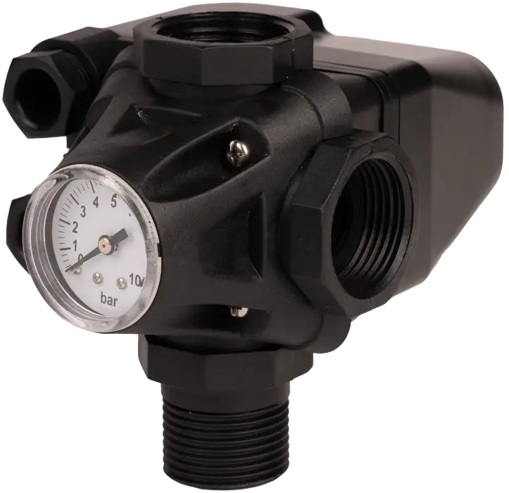 Construit pentru fiabilitate si precizie, dispozitivul permite reglarea presiunii de lucru in intervalul 1.4 – 2.8 bar, oferind protectie optima pompei si mentinand o presiune constanta in sistem. Manometrul integrat (0–10 bar) permite monitorizarea facila si rapida a presiunii.