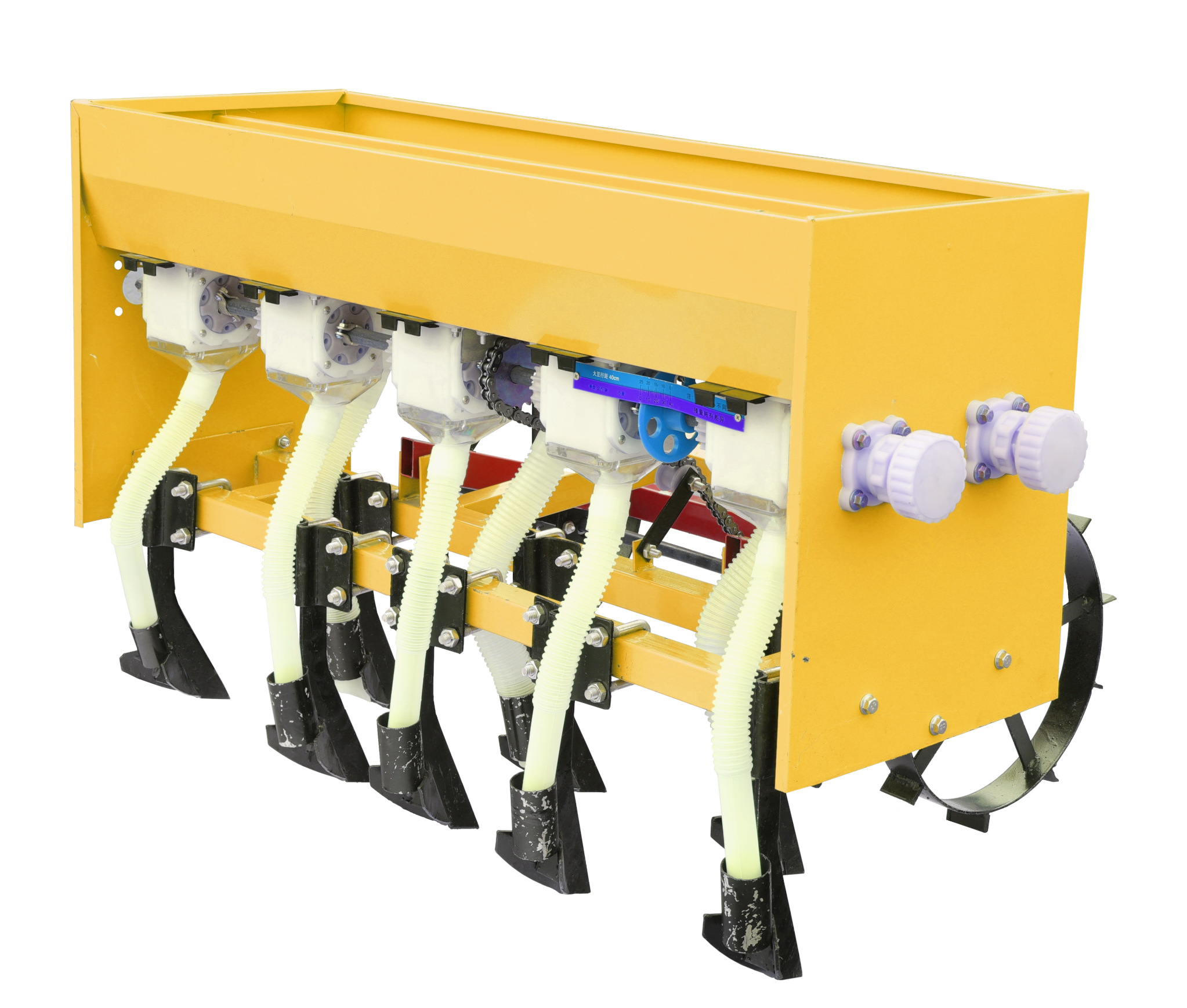 Transmisie și angrenaje: Roți metalice antrenate de deplasarea pe sol; lanț de transmisie către mecanismul de distribuire a semințelor și îngrășământului