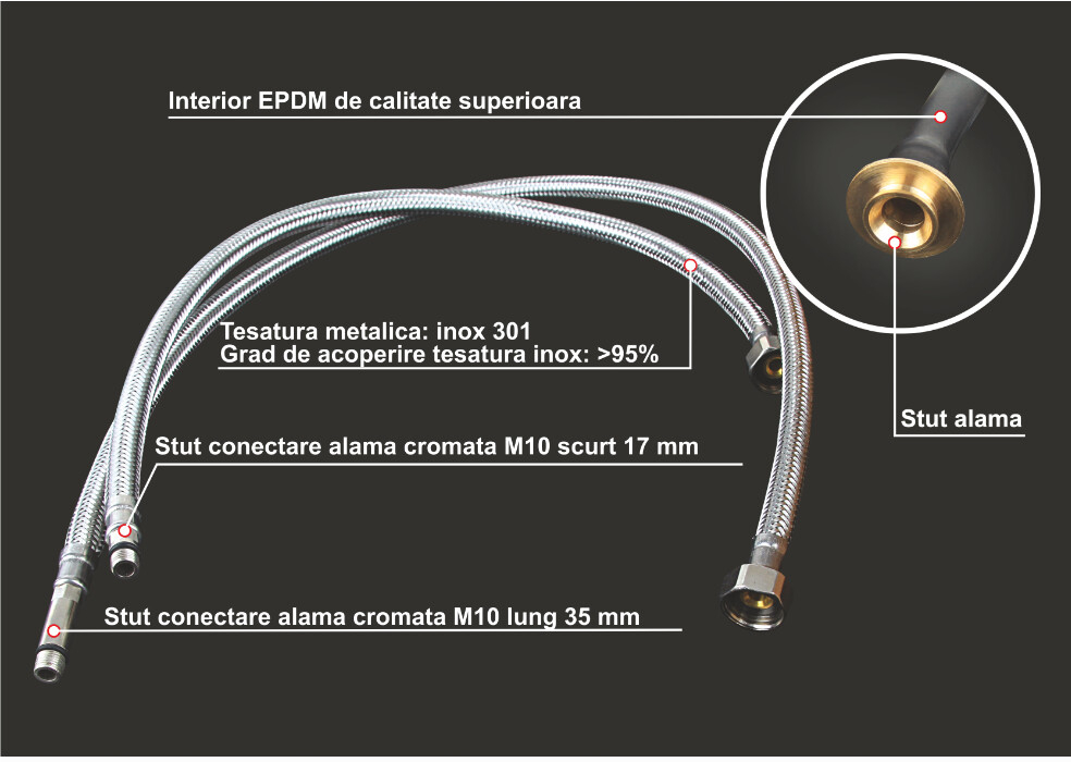 Racord flexibil de inalta calitate cu tesatura exterioara din otel inox 301, tubulatura interioara din EPDM si piulite din alama zincata