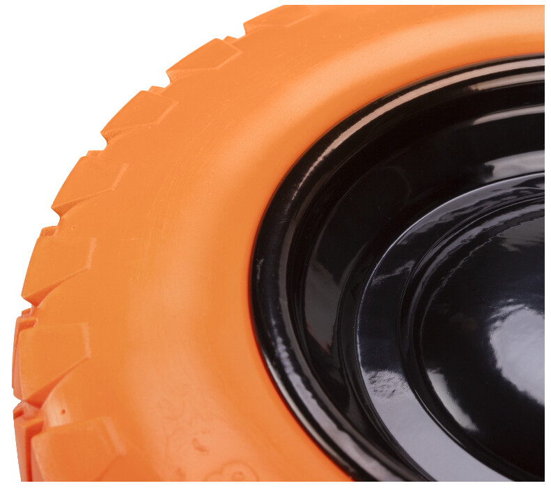 Roata Roaba plina Poliuretan cu Janta Metalica A EvoTools este o roata construita pe suport din metal si parte activa plina, din spuma poliuretanica, ceea ce confera un grad 0 de perforare si spargere fata de rotile clasice cu camera pe aer, dar acelasi confort in utilizare. Aceasta are bucsa sinterizata cu diametrul interior de 16 mm.
