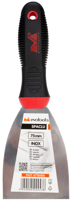 Spaclul TPR 2001 EvoTools are lama confectionata din inox de cea mai buna calitate si manerul bicomponent confectionat din polipropilena si cauciuc termoplastic (TPR). Lama are o grosime variabila de la varf catre maner, avand astfel o flexibilitate mare in timpul utilizarii. Manerul ergonomic va ofera o priza optima in timpul utilizarii, avand un profil in relief care elimina riscul de alunecare chiar si atunci cand aveti mainile ude. Este utilizat la renovarea si finisarea suprafetelor, inclusiv aplicarea ipsosului sau razuirea murdariei de pe suprafete.
