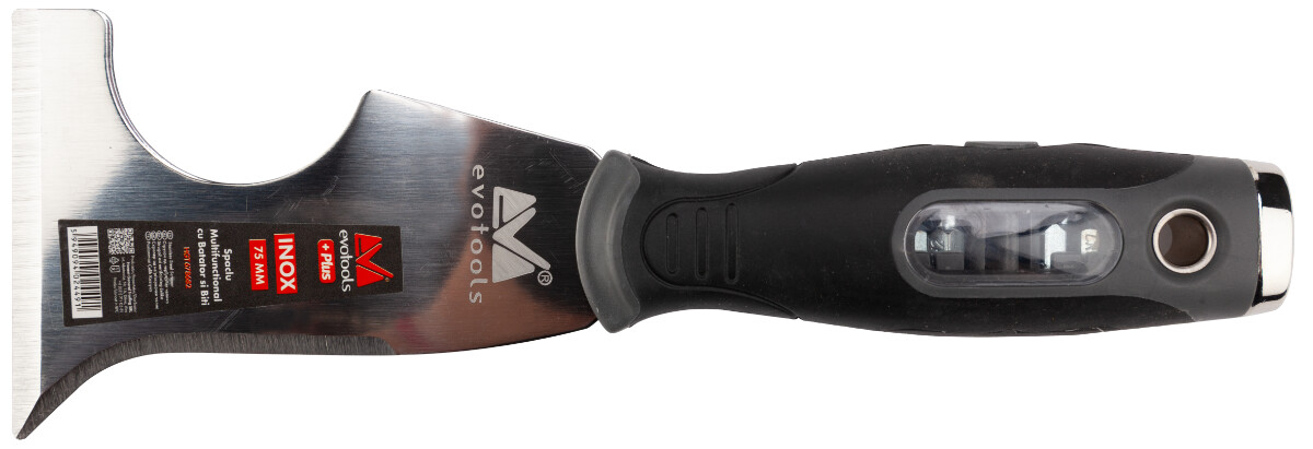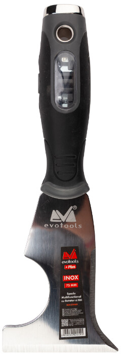 Spaclul multifunctional este dotat cu lama de 1.6 mm grosime din INOX ascutita la margine si maner din ABS si TPR prevazut cu striatii antialunecare ce confera o manipulare sigura si placuta pentru utilizator.