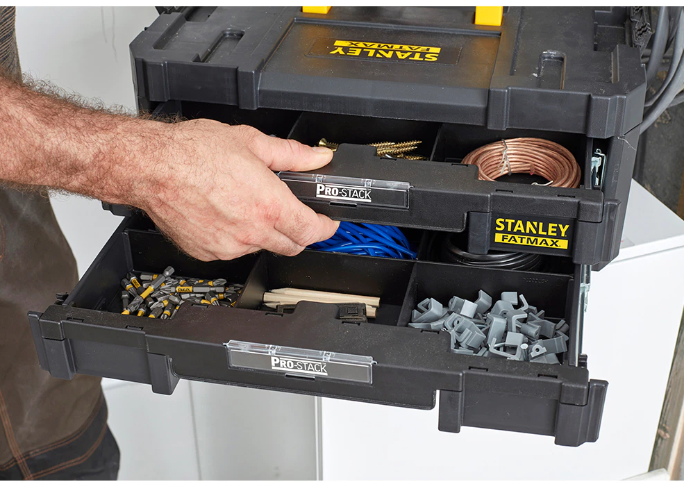 STANLEY® FATMAX® PRO-STACK ™ este un sistem de depozitare cu optiune de interblocare construit pentru munca si ofera versatilitate. Dotat cu multe optiuni usor de utilizat STANLEY® FATMAX® PRO-STACK ™ este partenerul ideal ce va poate ajuta in a face o munca usoara si rapida. Fiecare unitate PRO-STACK ™ are un sistem puternic de interconectare ce iti permite sa prinzi sau sa elimini cutiile usor si rapid.