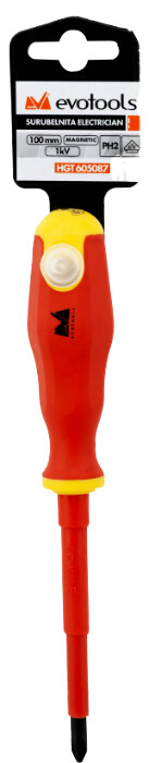 Acest tip de surubelnita EvoTools are partea utila confectionata din otel Cr-V de cea mai buna calitate, tratat termic, fiind acoperita de un strat izolator de polipropilena. Varful magnetic va ofera o fixare buna a surubului, eliminand riscul ca surubul sa ajunga in zone greu accesibile, reducand riscul accidentelor electrice. Manerul confectionat din polipropilena de inalta calitate va ofera o priza optima si confort in timpul utilizarii. Surubelnita este fabricata conform standardului european EN 60900 (VDE) pentru a va oferi o protectie electrica de pana la 1000 V (1 KV).