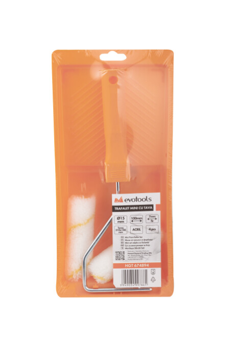Acest set pentru vopsit EvoTools este solutia ideala pentru a va renova locuinta sau vopsi diverse suprafete din locuinta dumneavoastra. Trafaletul are suportul de fixare al ruloului confectionat dintr-o tija de otel cu grosimea de 6 mm si un maner din polipropilena rezistent la socurile mecanice. Ruloul confectionat din acril, cu lungimea firului de 7 mm, retine o cantitate optima de vopsea, astfel incat sa vopsiti uniform suprafetele. Tava este confectionata din polipropilena, avand dimensiunea (L x l x h) 310x150x42 mm.