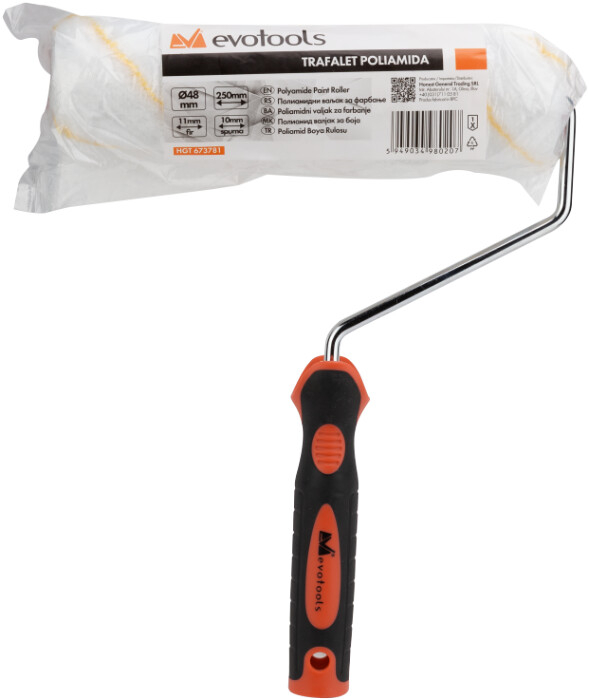Marca Evotools Professional reprezinta gama de scule si unelte destinata micilor mesteri, avand o calitate superioara ceea ce le face a fi destinate uzului semi-profesional. Trafaletul EvoTools este solutia ideala pentru a va renova locuinta sau vopsi diverse suprafete din locuinta dumneavoastra. Manerul este confectionat din cauciuc termoplastic, rezistent la socurile mecanice. Ruloul confectionat din poliamida, cu lungimea firului de 11 mm, retine o cantitate optima de vopsea, astfel incat sa vopsiti uniform suprafete rugoase sau fatade exterioare.