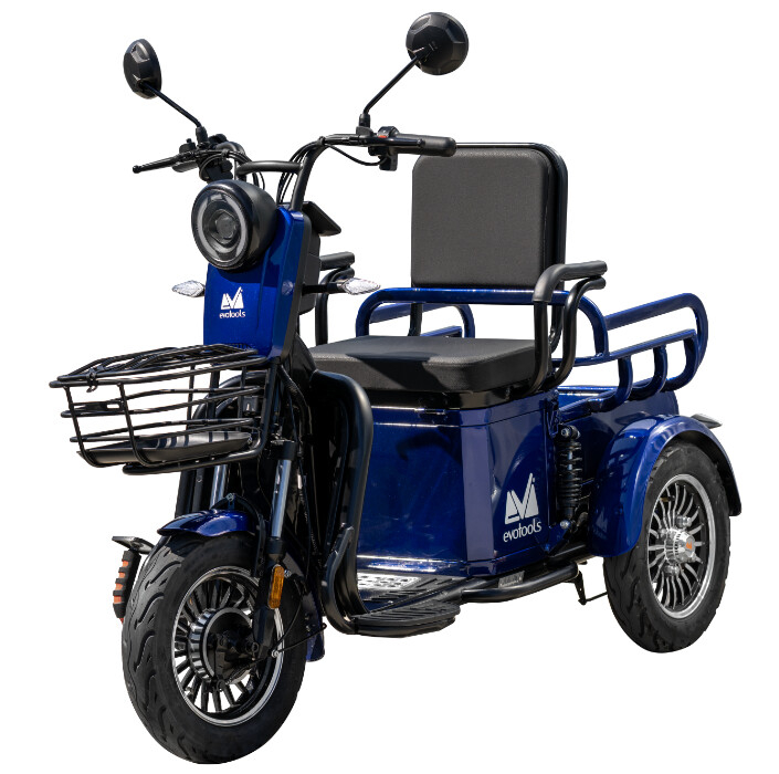 Triciclul electric pentru persoane TRP500 EvoTools este potrivit tuturor categoriilor de varsta, atat pentru plimbarile din orasul aglomerat, acolo unde dimensiunile sale reduse reprezinta un plus, cat si pentru drumurile la piata sau gradina din zonele rurale, avand o mica bena in partea din spate, atat de necesara pentru transportarea cumparaturilor sau a uneltelor.