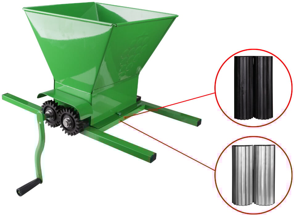 Acest tip de zdrobitor de struguri Evotools este actionat manual. Prin rotatia manetei, sunt actionate angrenajele care pun in miscare rolele folosite la zdrobirea strugurilor. Cuva este acoperita cu un strat de vopsea in camp electrostatic, avand dimensiunea (LxlxH) de 390x380x310 mm. Rolele confectionate din poliamida sau aluminiu, cu lungimea de 220 mm, au posibilitate de reglare prin distantarea sau apropierea acestora, de ordinul milimetrilor, astfel incat sa obtineti rezultatele dorite. Rolele confectionate din aluminiu au o mai buna rezistenta in timp, avand muchii mai ascutite decat a altor role confetionate din polimeri, astfel incat sa se obtina o mai buna zdrobire a fructelor. Lungimea cadrului suport este de 665 mm. Structura robusta si materialele de buna calitate folosite la confectionare, determina o durata mare de viata a zdrobitorului, astfel incat sa aveti un randament optim in timpul utilizarii.